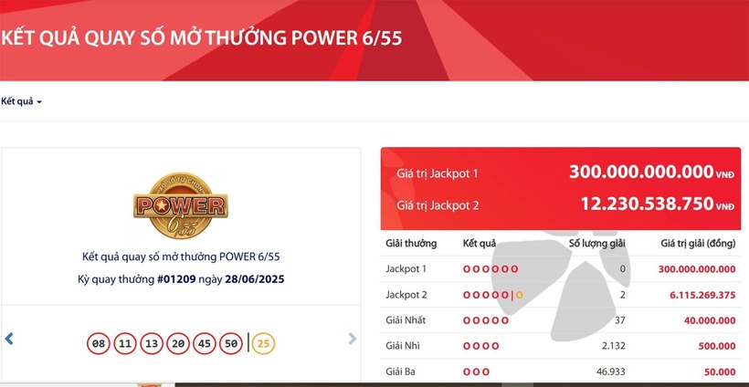Kết quả xổ số Vietlott hôm nay 28/6/2025: Tìm chủ nhân may mắn cho giải Jackpot 1 loại hình Power 6/55.