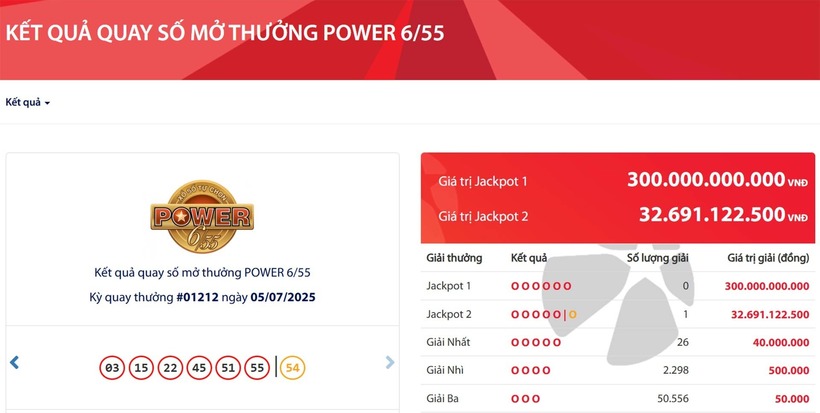 Kết quả xổ số Vietlott hôm nay 3/7/2025: Tìm chủ nhân may mắn cho giải Jackpot 1 loại hình Power 6/55.